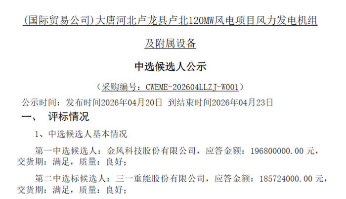 公告显示,第一中选候选人:金风科技股份有限公司,应答金额:196800000.00元。第二中选标候选人:三一重能股份有限公司,应答金额:185724000.00元。