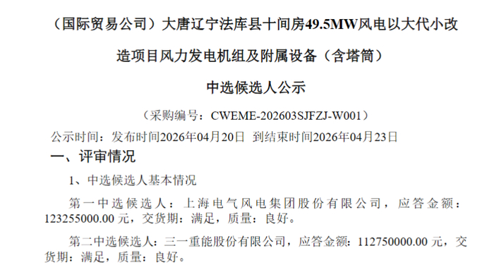 公告显示,第一中选候选人:上海电气风电集团股份有限公司,应答金额:123255000.00元。第二中选候选人:三一重能股份有限公司,应答金额:112750000.00元。