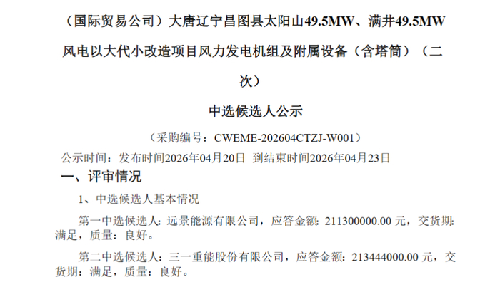 公告显示,第一中选候选人:远景能源有限公司,应答金额:211300000.00元。第二中选候选人:三一重能股份有限公司,应答金额:213444000.00元。